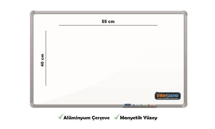 İnter Yazı Tahtası Manyetik Yüzey 40x55 Cm INT-637   Kullanışlı Kolay yazılıp silinen ve leke bırakmayan, daha parlak beyaz zemin. Fonksiyonel Manyetik yüzeyi sayesinde aynı zamanda pano olarak da kullanılabilir. Beyaz tahta kalemleri, silgi ve istenilen objeler, görseller yüzeye mıknatıslarla tutturulabilir. Dayanıklı Daha uzun ömürlüdür. Laminant yüzeyli yazı tahtaları 2 yıl garantiliyken, manyetik yüzeyli yazı tahtaları 5 yıl garantilidir. Uygun fiyatlı Üstelik tüm bu üstün özellikleriyle birlikte, neredeyse laminanta yakın bir fiyatla satışa sunulmuştur. Elegant Çerçeve Saten rengi eloksal kaplamalı alüminyum elegant çerçeve. Dekoratif görünümlüdür, korozyona dayanıklıdır. Sağlığa uygundur.   Kolaylıkla asılabilir.
